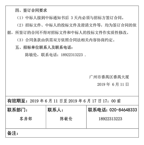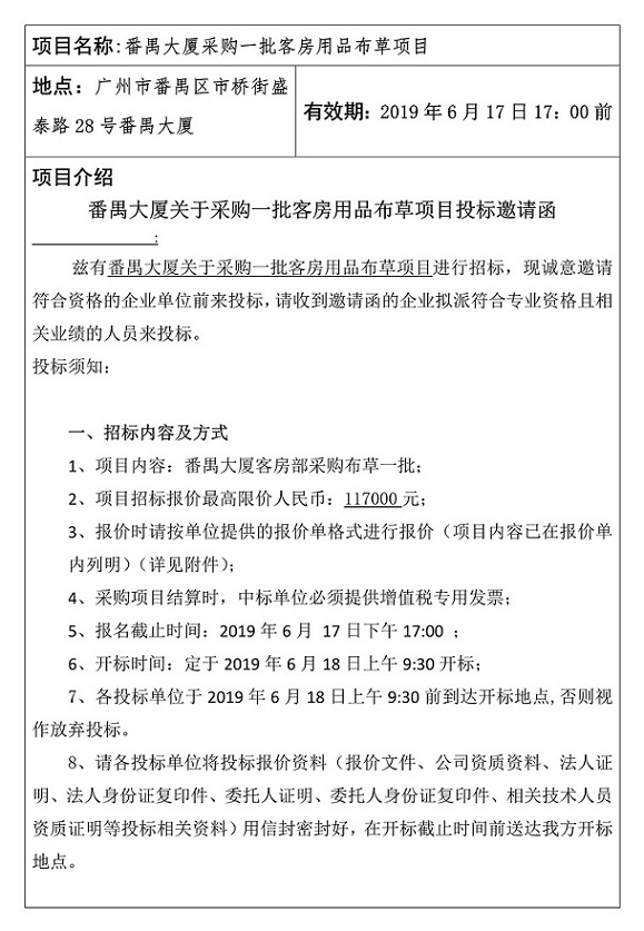 番禺大廈采購一批客房用品布草項目邀標公示 發布日期:2019-06-11 分享: 附件一:番禺大廈采購一批客房用品布草招標文件 附件二:番禺大廈關于采購一批客房用品布草項目投標邀請函 下一篇: 番禺賓館八佰膳餐廳空調改造項目 返回