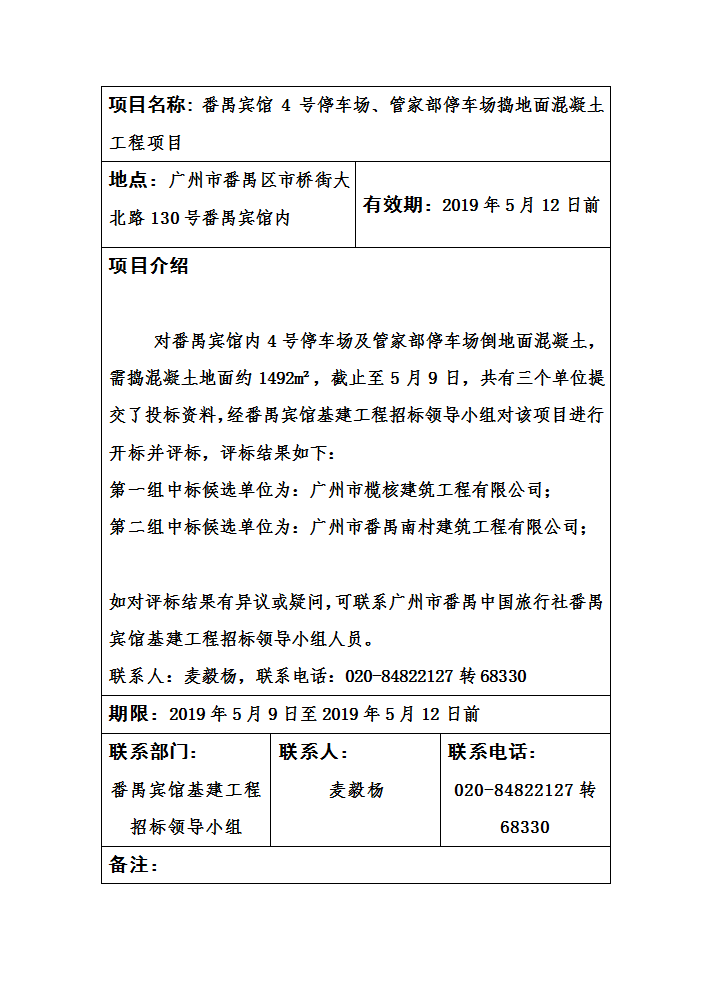 番禺賓館4號停車場、管家部停車場搗地面混凝土工程中標候選人公示