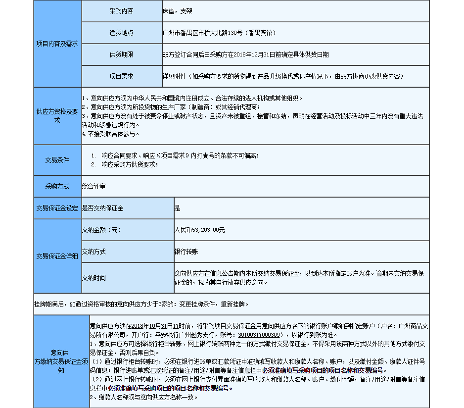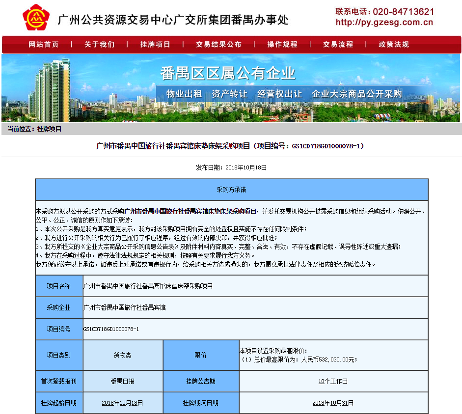 廣州市番禺中國旅行社番禺賓館床墊床架采購項目
