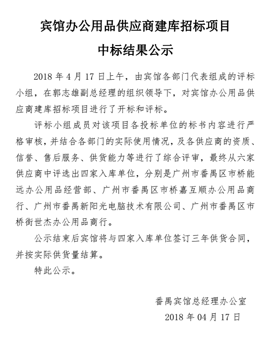 番禺賓館辦公用品供應商建庫招標項目中標結果公示
