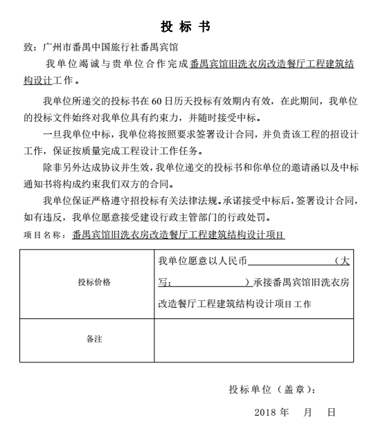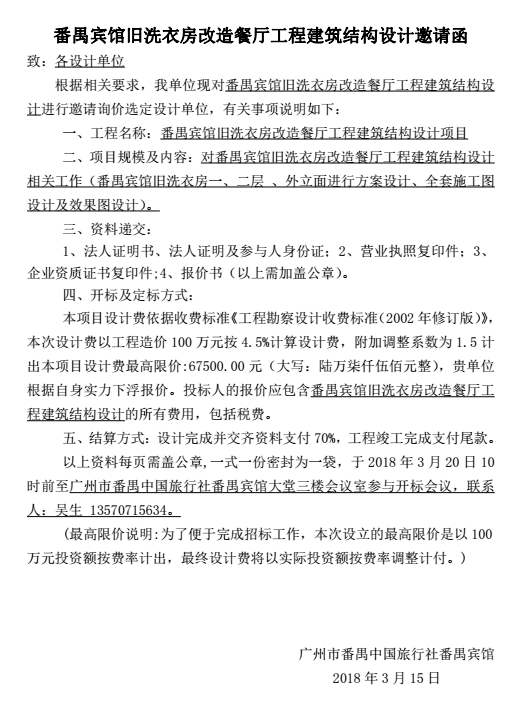 番禺賓館舊洗衣房改造餐廳工程建筑結(jié)構(gòu)設(shè)計(jì)邀請(qǐng)函 發(fā)布日期:2018-03-17 分享: 下一篇: 番禺賓館、番禺大廈客房一次性用品供應(yīng)商資格項(xiàng)目競(jìng)爭(zhēng)性磋商采購(gòu)公告 返回