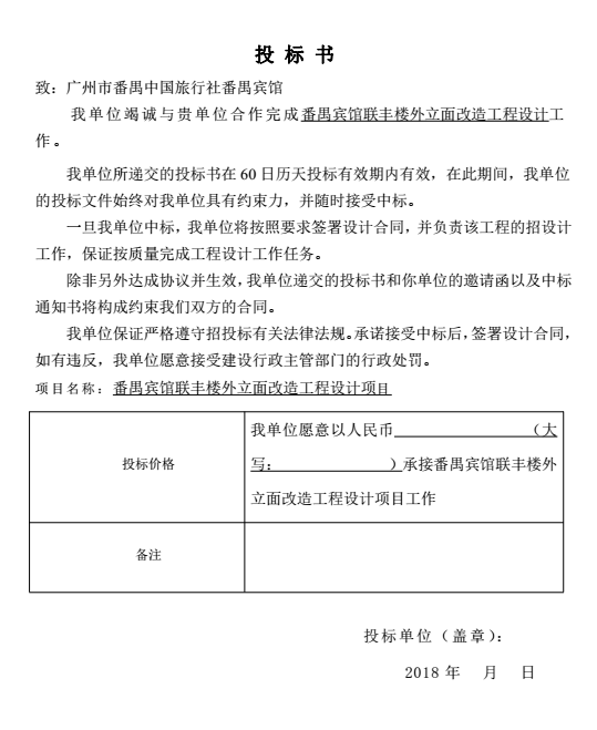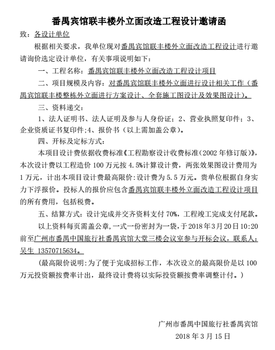 番禺賓館聯豐樓外立面改造工程設計邀請函
