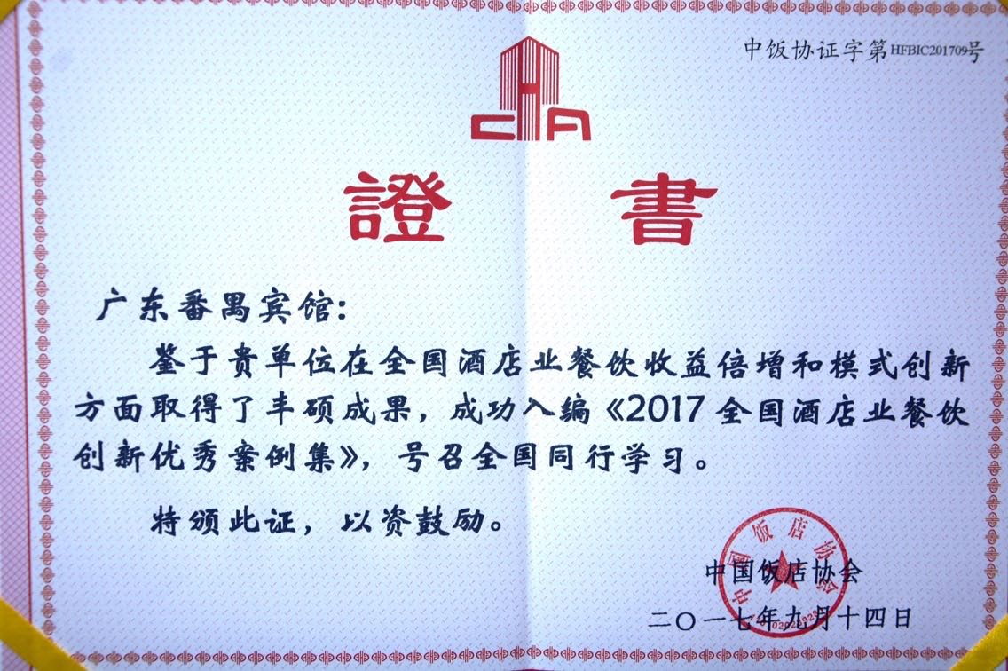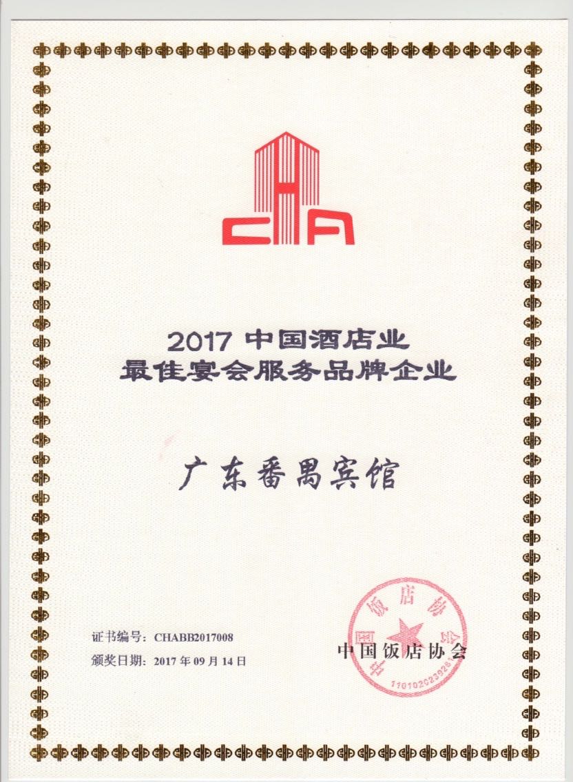 在同期舉辦的第十八屆中國美食節(jié)上,番禺賓館因良好的餐飲服務(wù)質(zhì)量、突出的喜慶宴會(huì)接待服務(wù)品牌效應(yīng),顯著的傳承、改革、創(chuàng)新成果,順利榮獲“2017中國酒店業(yè)最佳宴會(huì)服務(wù)品牌企業(yè)”獎(jiǎng)項(xiàng)。