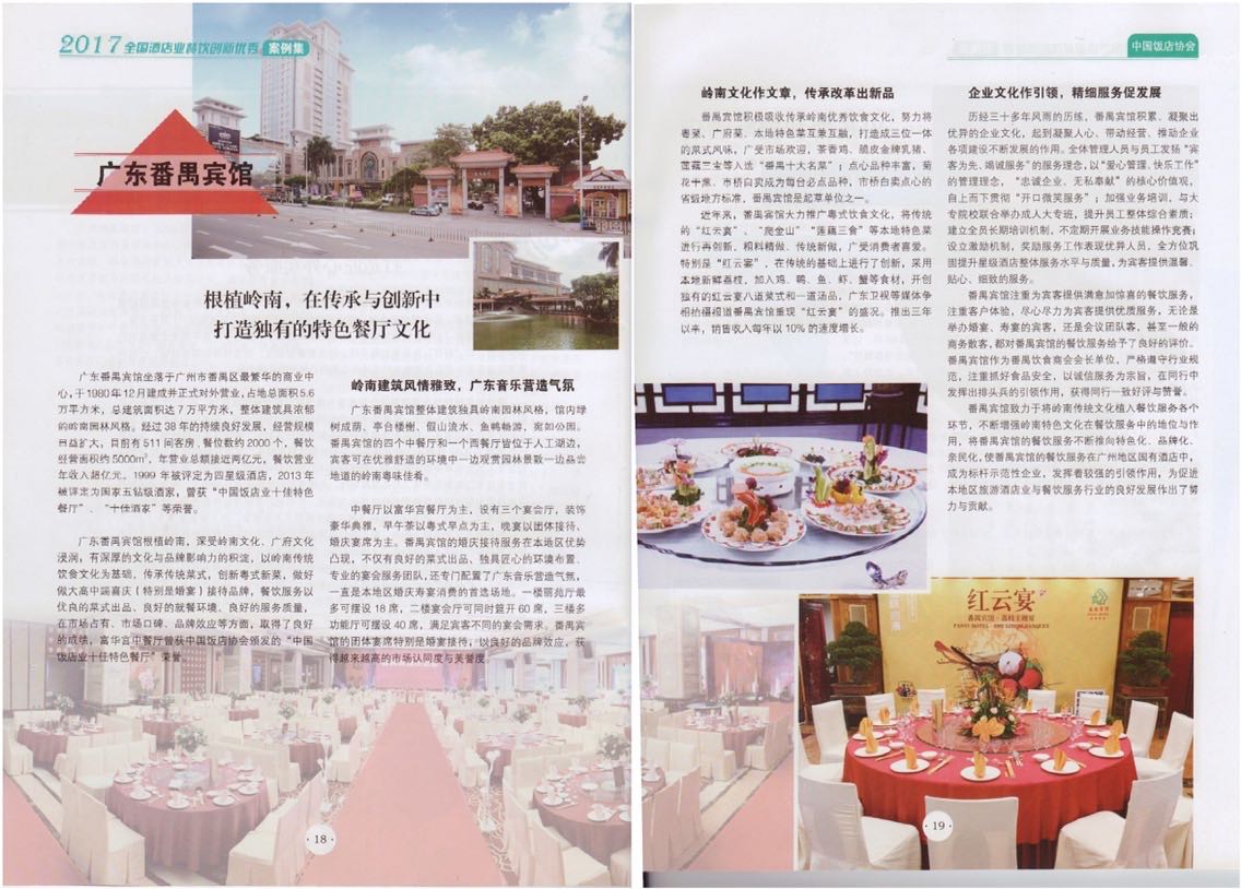 番禺賓館古耀堅(jiān)總經(jīng)理受邀參加了“2017全國酒店業(yè)倍增餐飲收益與品牌模式創(chuàng)新經(jīng)驗(yàn)交流會(huì)”,作了題為“傳承、改革、創(chuàng)新,開拓番禺賓館餐飲發(fā)展新空間”的交流分享,該分享材料也成功入選中國飯店協(xié)會(huì)編撰的《2017全國酒店業(yè)餐飲創(chuàng)新優(yōu)秀案例集》。
