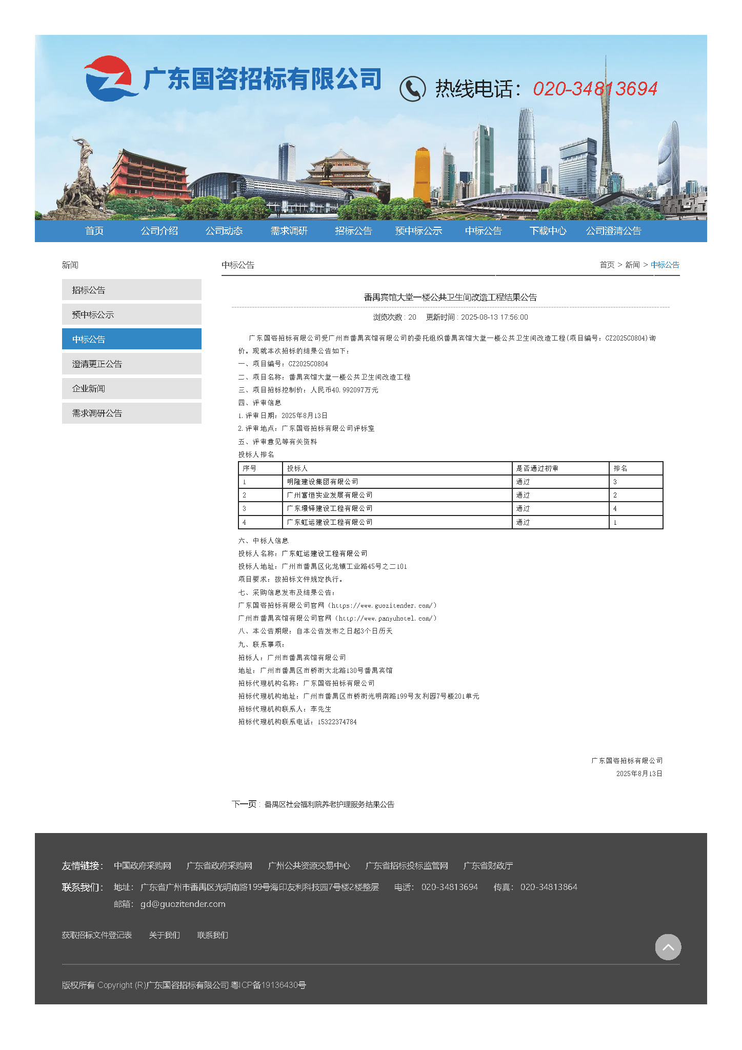 番禺賓館大堂一樓公共衛生間改造工程結果公告 發布日期:2025-08-13 分享: https://www.guozitender.com/article/news-i03561i1.html 下一篇: 番禺賓館關于出租大堂二樓2-10號商鋪的信息公告 返回