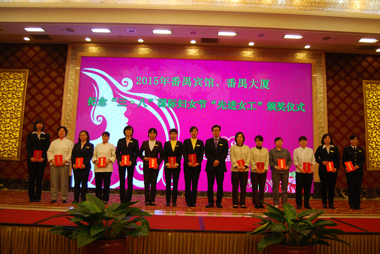 番禺賓館、番禺大廈全體女員工在平凡的工作崗位上忠誠服務(wù),在繁重的工作任務(wù)中積極奉獻(xiàn),自覺提高自身綜合素質(zhì),出色完成各項(xiàng)工作,充分展現(xiàn)出積極向上的巾幗風(fēng)采,真正發(fā)揮出“半邊天”作用,為賓館、大廈可持續(xù)發(fā)展貢獻(xiàn)了自己的力量。為表彰她們一年來的努力工作與良好表現(xiàn),3月8日,番禺賓館、番禺大廈組織女員工,在富華宮三樓舉辦紀(jì)念“三.八” 國際婦女節(jié)“先進(jìn)女工”頒獎(jiǎng)儀式。賓館工會副主席、人力資源部經(jīng)理、總經(jīng)理辦公室副主任、女職委主任黃艷萍同志向賓館、大廈全體女員工致了“三·八節(jié)”賀詞,向各位女員工致以節(jié)日的問候,并宣讀了《關(guān)于表彰2014年度賓館、大廈“先進(jìn)女工”的決定》,古耀堅(jiān)總經(jīng)理和郭志雄副總經(jīng)理為獲評“先進(jìn)女工”的31名女員工頒發(fā)了榮譽(yù)證書。