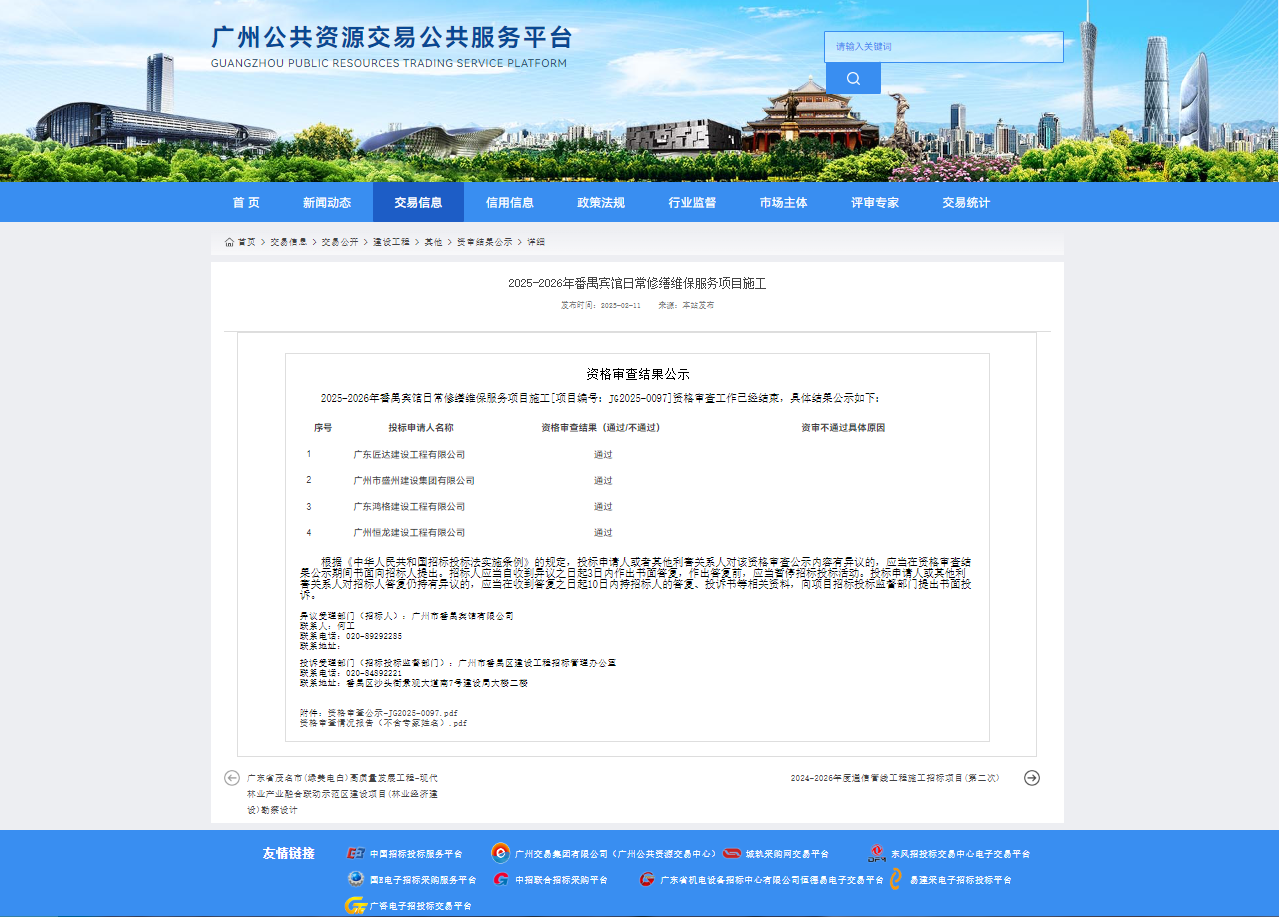 2025-2026年番禺賓館日常修繕維保服務(wù)項(xiàng)目施工資格審查結(jié)果公示 發(fā)布日期:2025-02-11 分享: 詳情請(qǐng)查詢廣州公共資源交易公共服務(wù)平臺(tái)官網(wǎng):http://www.gzebpubservice.cn/qtzsjggs/496404.htm 下一篇: 2025-2026年番禺賓館日常修繕維保服務(wù)項(xiàng)目施工中標(biāo)候選人公示 返回