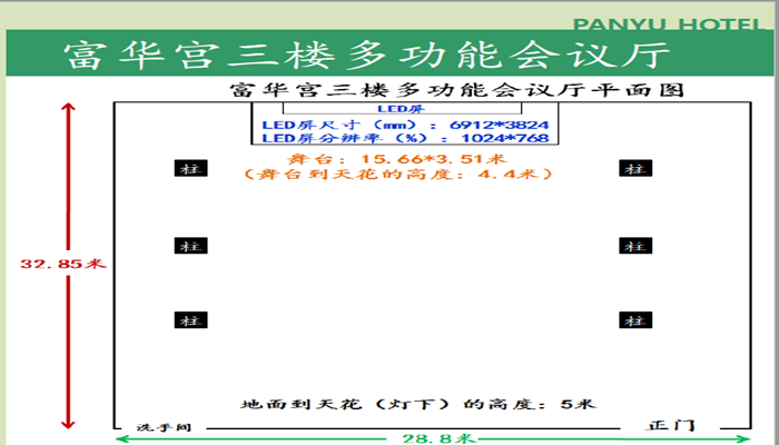 全新豪華裝修多功能會議廳,位于酒店的富華宮三樓,內(nèi)設(shè)大型LED背景屏及專業(yè)舞臺燈光音響。有15.66(寬)*…
