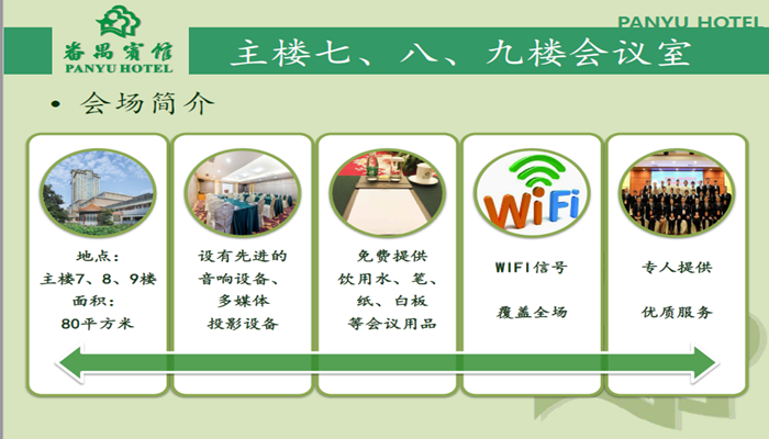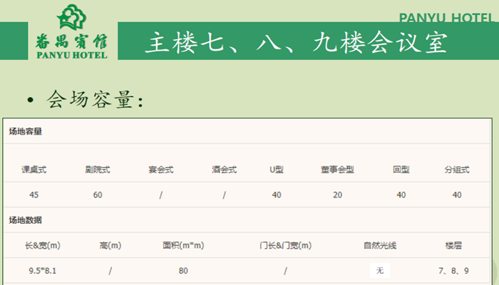 主樓7-9樓會議室,面積80平方米左右,可容納20-60人舉辦會議,適合課桌、圓桌以及回形會議布置。